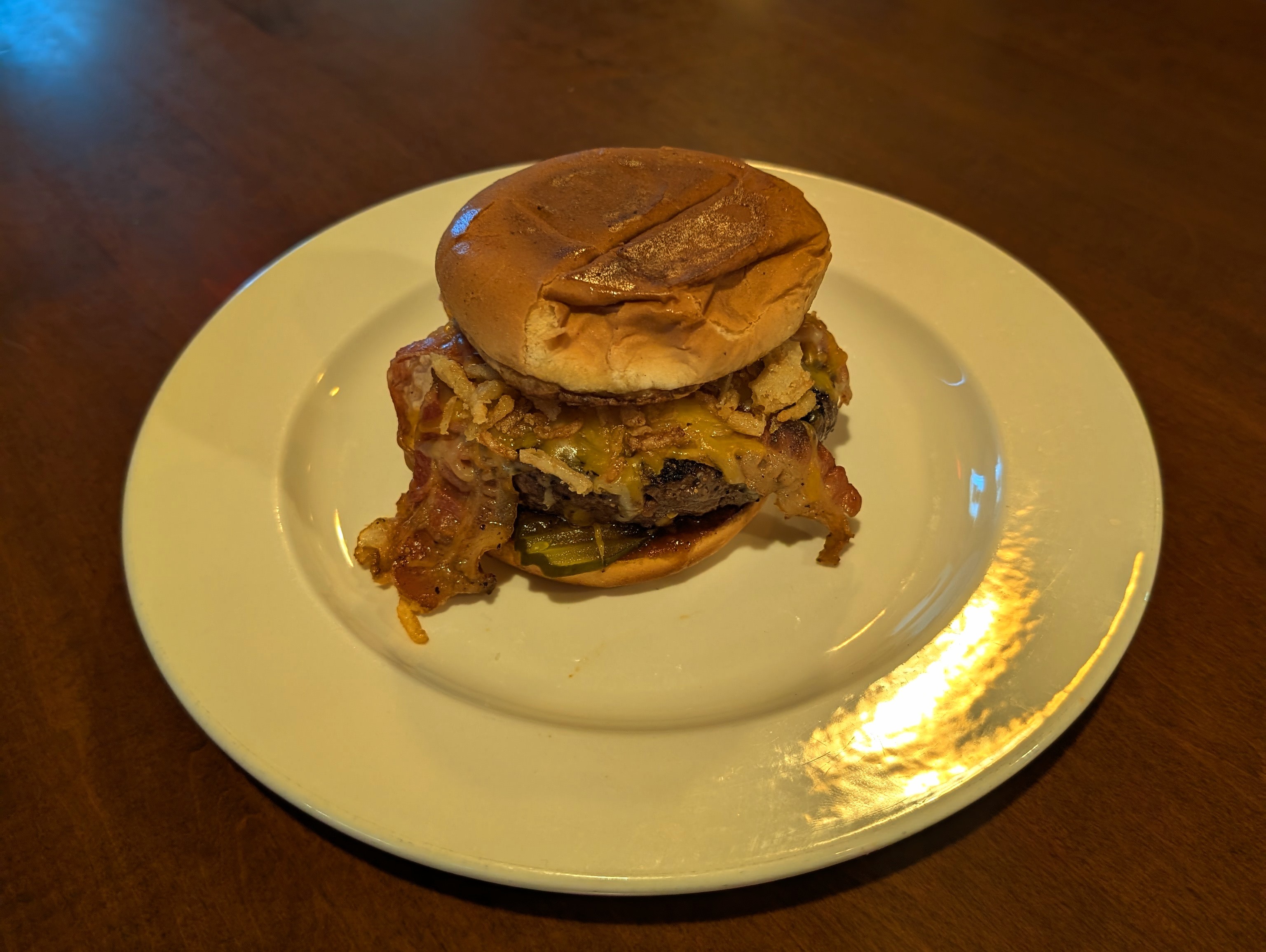 scratch made bacon bourbon bbq sauce, bacon, crispy onion straws, dill pickle chips and cheddar jack cheese. served with french fries or hand-cut chips.