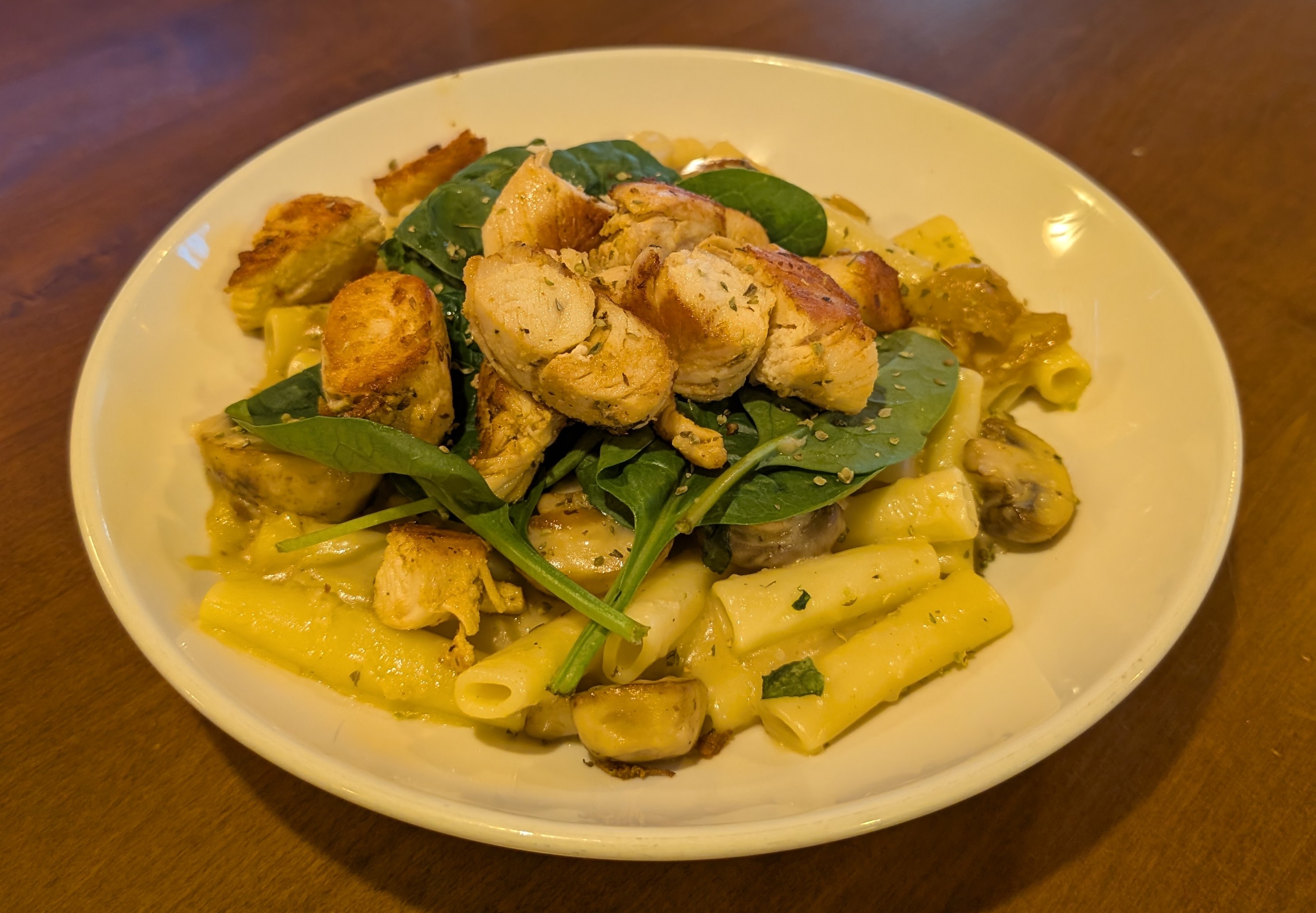 a scratch made cream sauce with caramelized onion and sauteed mushroom caps tossed with ziti pasta and topped with baby spinach leaves and grilled chicken
