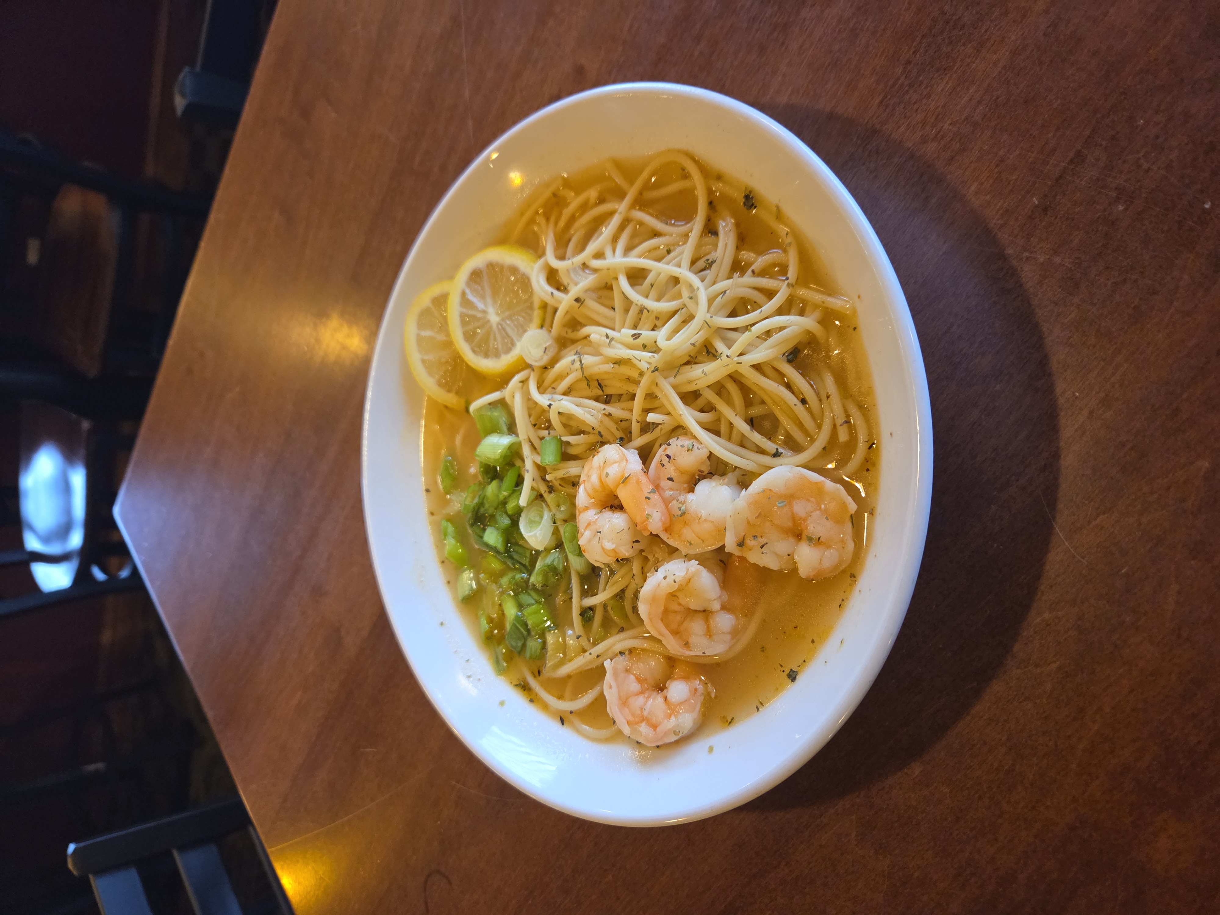 5 shrimp poached in ed's scratch made sriracha seafood stock with spaghetti noodles making a delicious bowl of hot pho