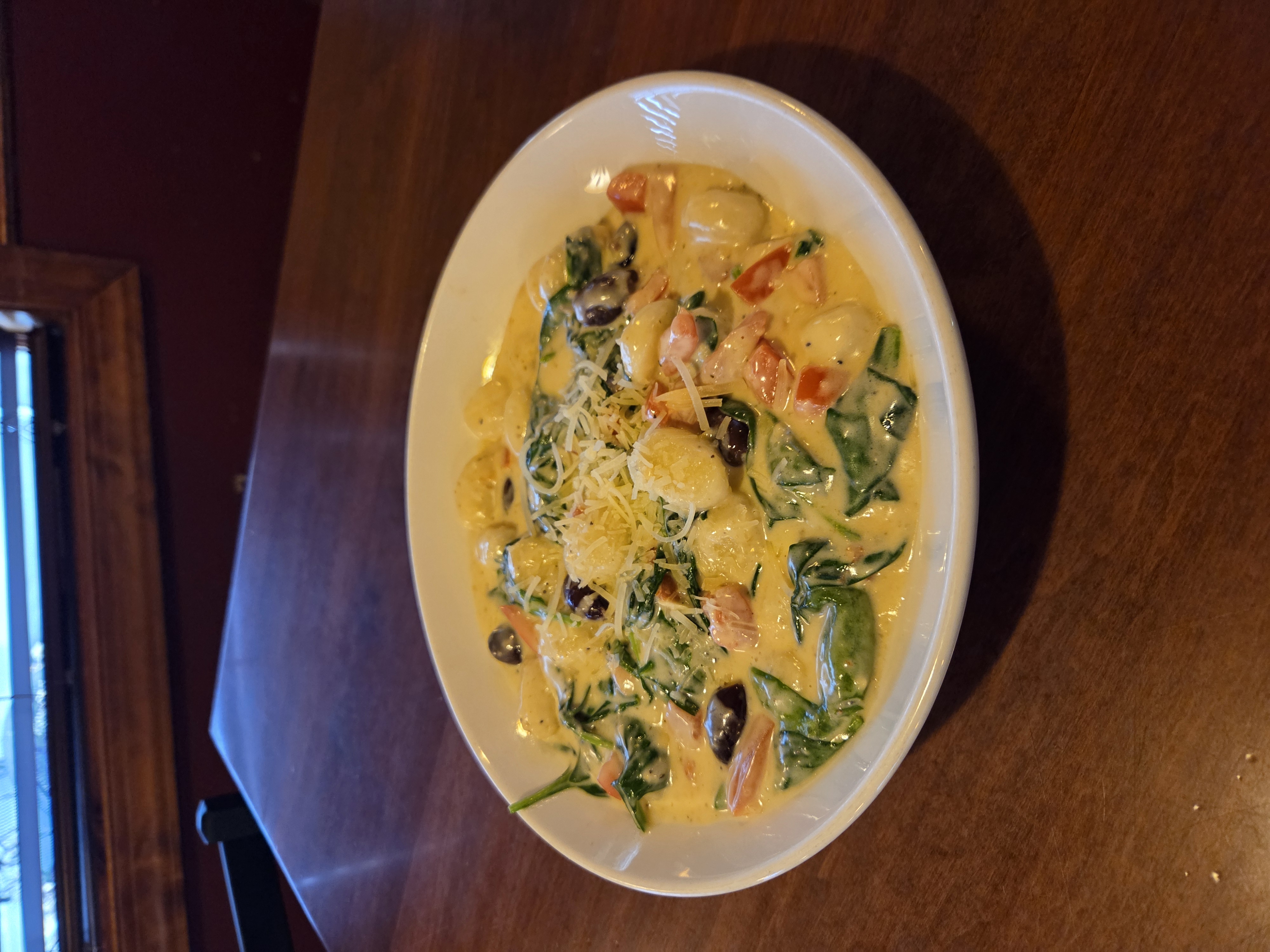 sauteed tomatoes, kalamata olives, spinach and chicken in a creamy alfredo sauce tossed with gnocchi potato dumplings and topped with feta cheese.