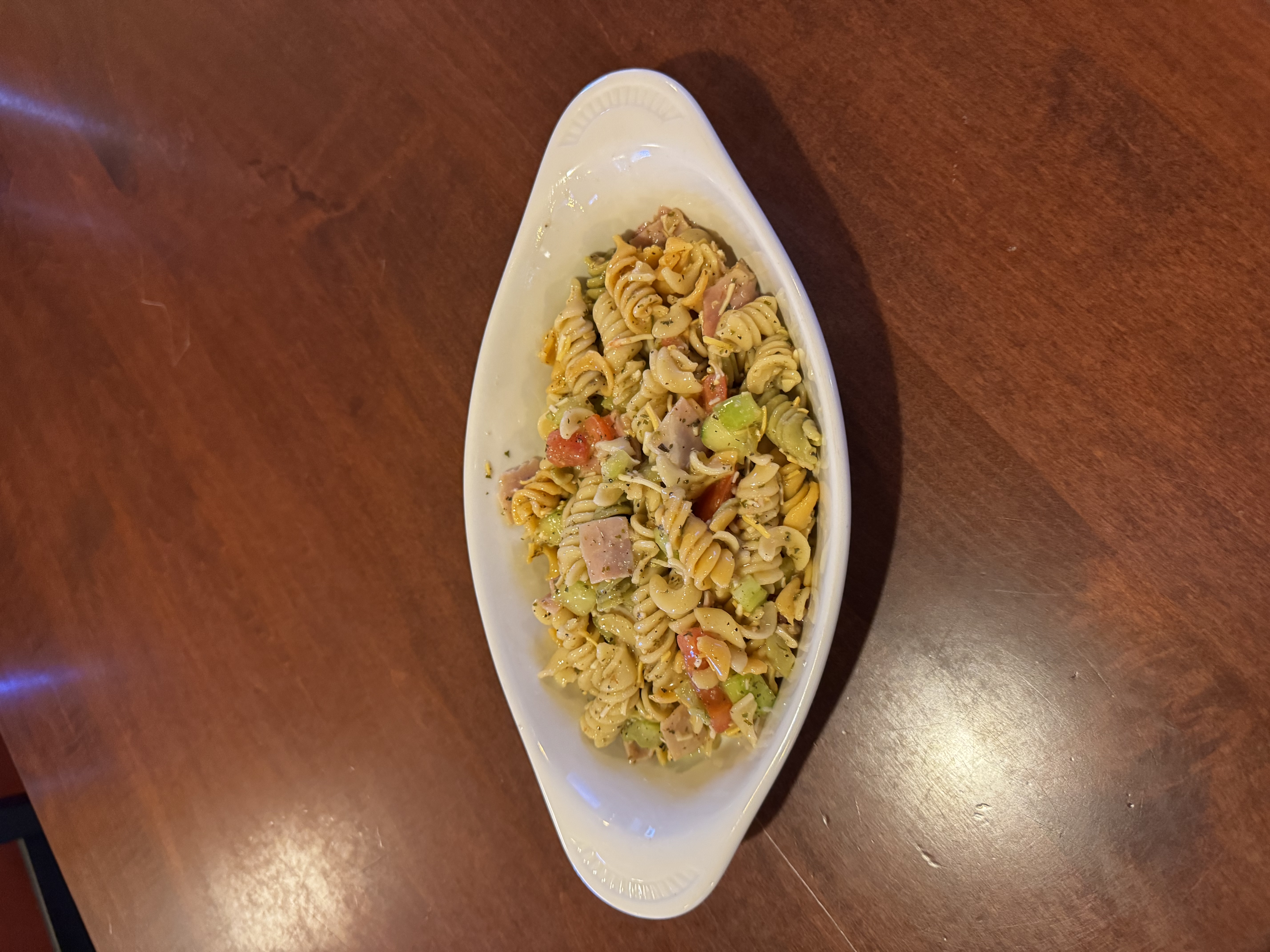 tri-colored pasta tossed with ham, cheddar jack cheese, cucumbers and our house-made italian dressing