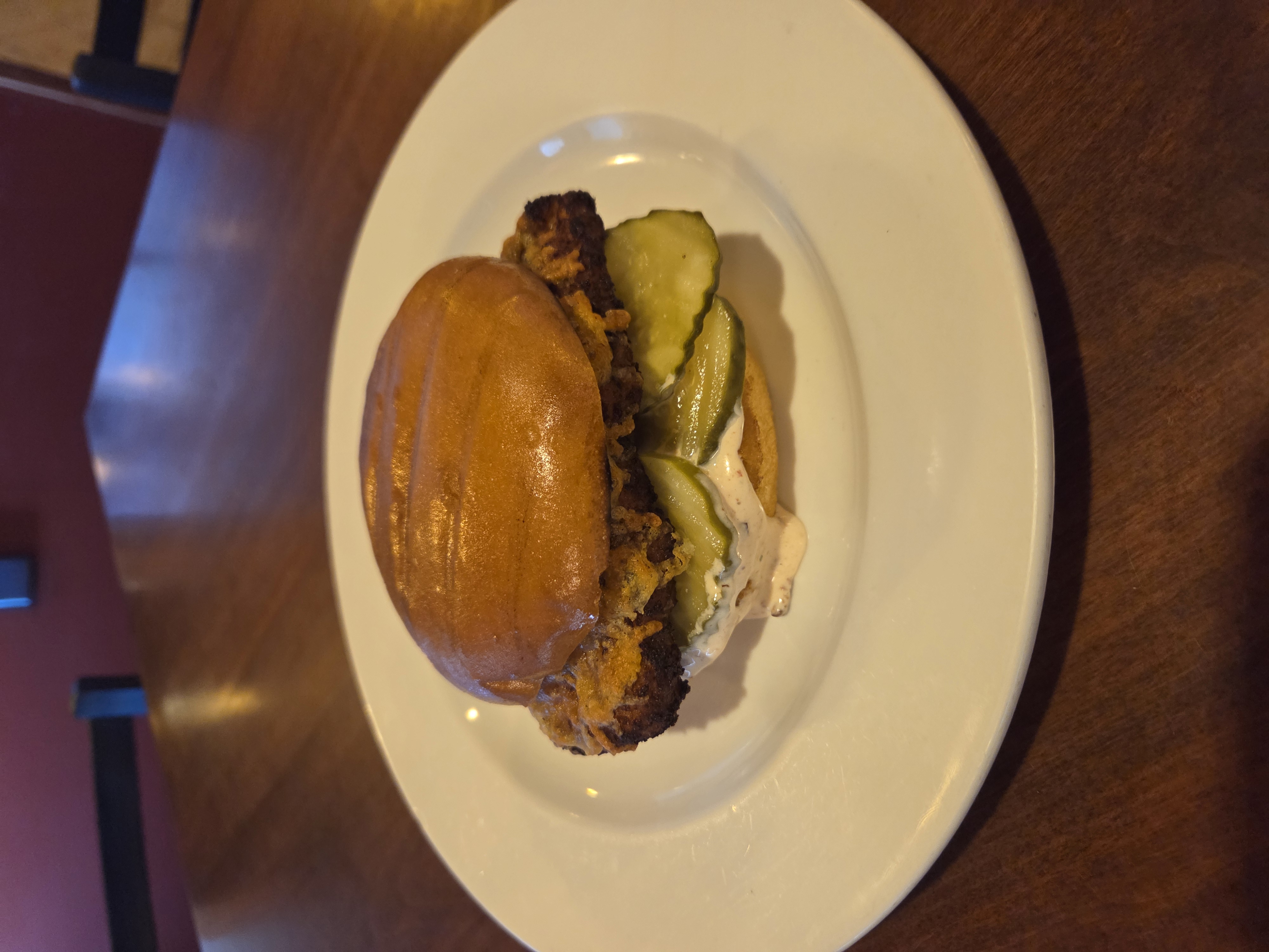 scratch made fried chicken breast, monterey jack cheese, crispy onion straws, dill pickle chips and chipotle ranch on a brioche bun. served with french fries or hand-cut chips.