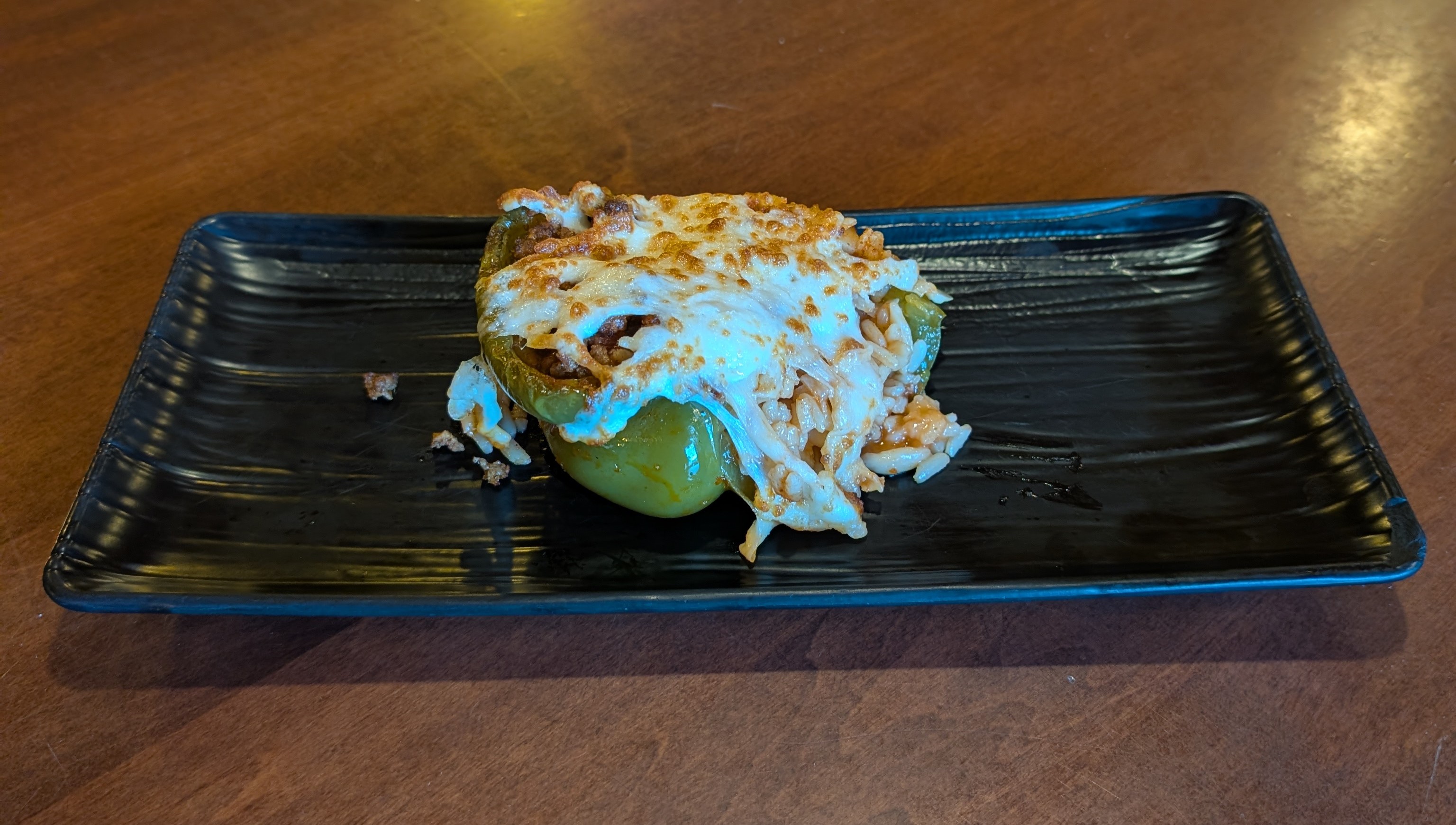 one half of a pepper stuffed with beef, rice, herbs & spices and topped with cheese